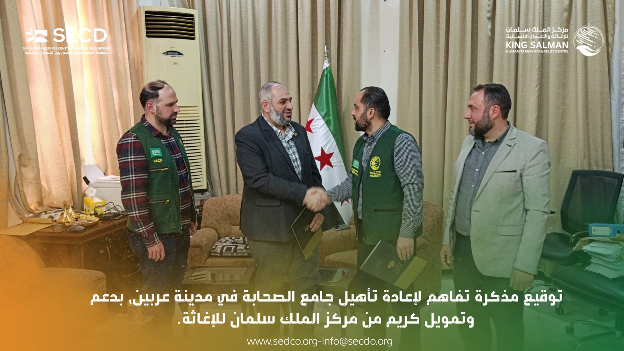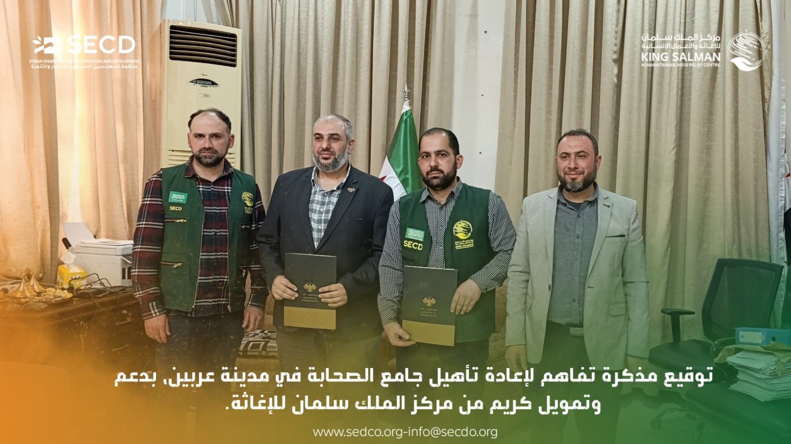 وقّعت منظمة المهندسين السوريين للإعمار والتنمية مذكرة تفاهم مع وزارة الأوقاف في الجمهورية العربية السورية ممثلة بمديرية أوقاف ريف دمشق، بهدف إعادة تأهيل جامع الصحابة في مدينة عربين، وذلك بدعم وتمويل كريم من مركز الملك سلمان للإغاثة والأعمال الإنسانية.